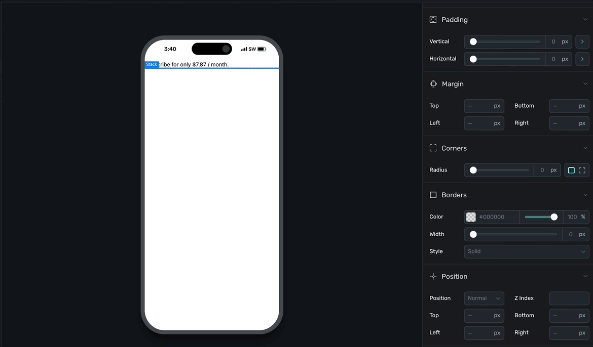 Remember, these are variables, so while some of them like background immediately reflect their changes, most of them will be referenced by you within a component. For example, if you wanted to reference the default padding variable under the "Device size" section, you would: