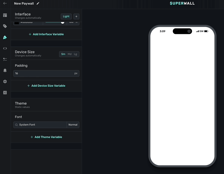 By default, Superwall uses the small device size. Simply click the + button to add more. By default, Superwall provides a padding device size variable: